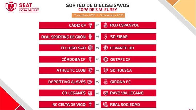 Ya se conocen todos los emparejamientos de los dieciseisavos de final de la Copa del Rey 2018-19, cuyos partidos de ida se disputarán durante la semana del 31 de octubre, mientras que los de vuelta se jugarán en la semana del 5 de diciembre