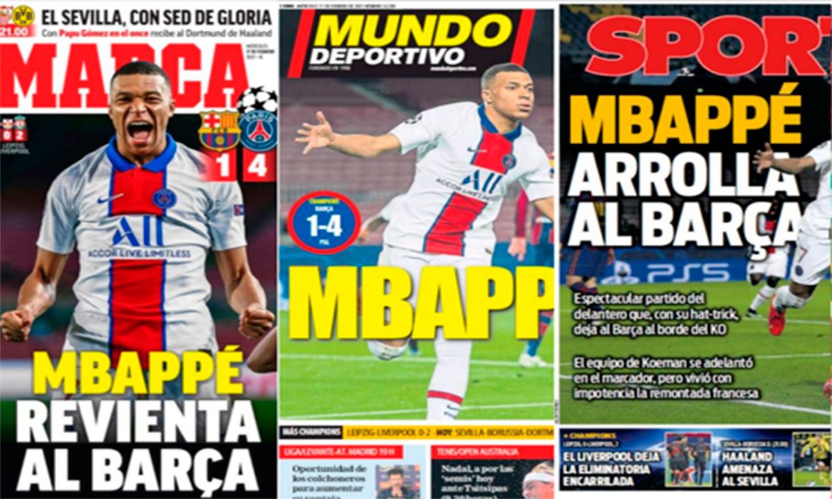 In the case of Mark, have titled "Mbappé pops to the Barça", in reference to the exhibition of the French, that complements informing that it treats of "a new Barcelona embarrassment in Champions". Besides, it signals that the eliminatory is practically sentenced in favour of the Parisians.