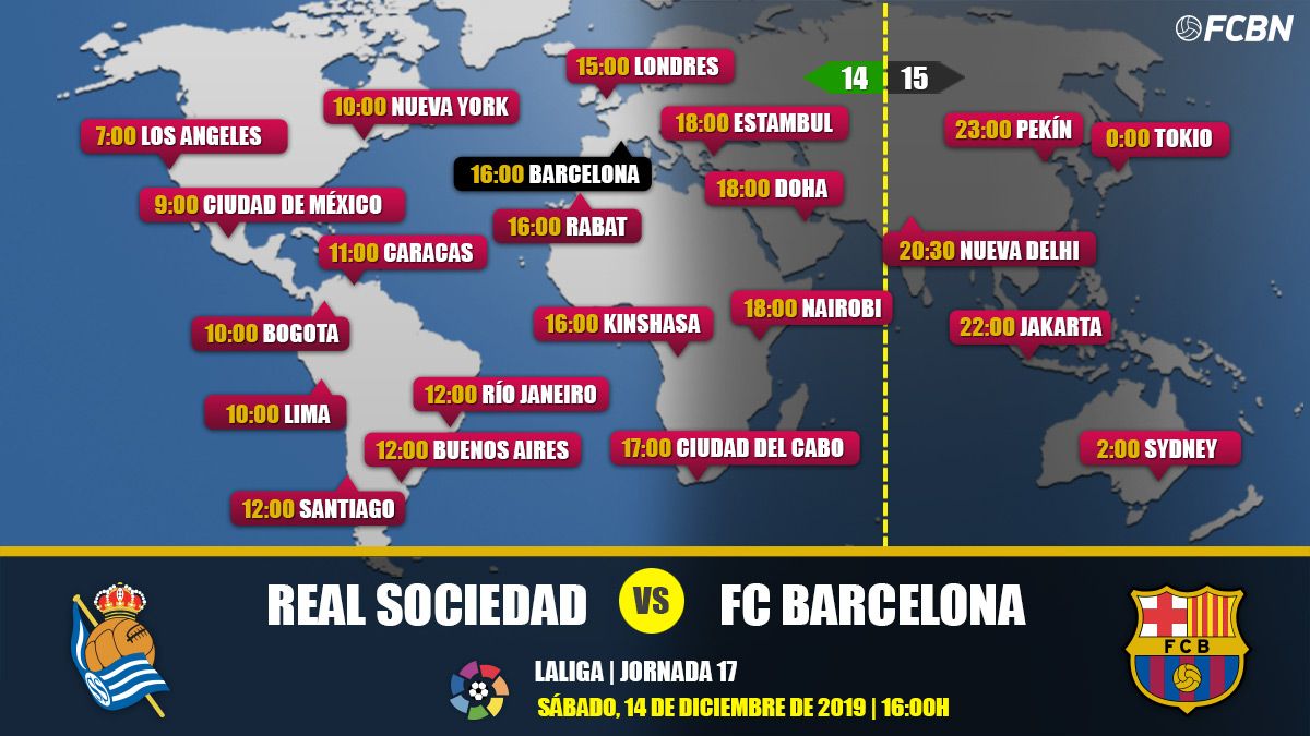 In Spain, the Real Sociedad-Barça will be televised in direct the Saturday 14 December to the 16:00 hours by the channels Movistar LaLiga, M. LaLiga UHD, mitele PLUS and LaLiga TV Bar, through the operators Movistar, Orange, Jazztel and Mitele, that will offer the match in Internet and with access from your mobile, tablet, computer or Smart TV.