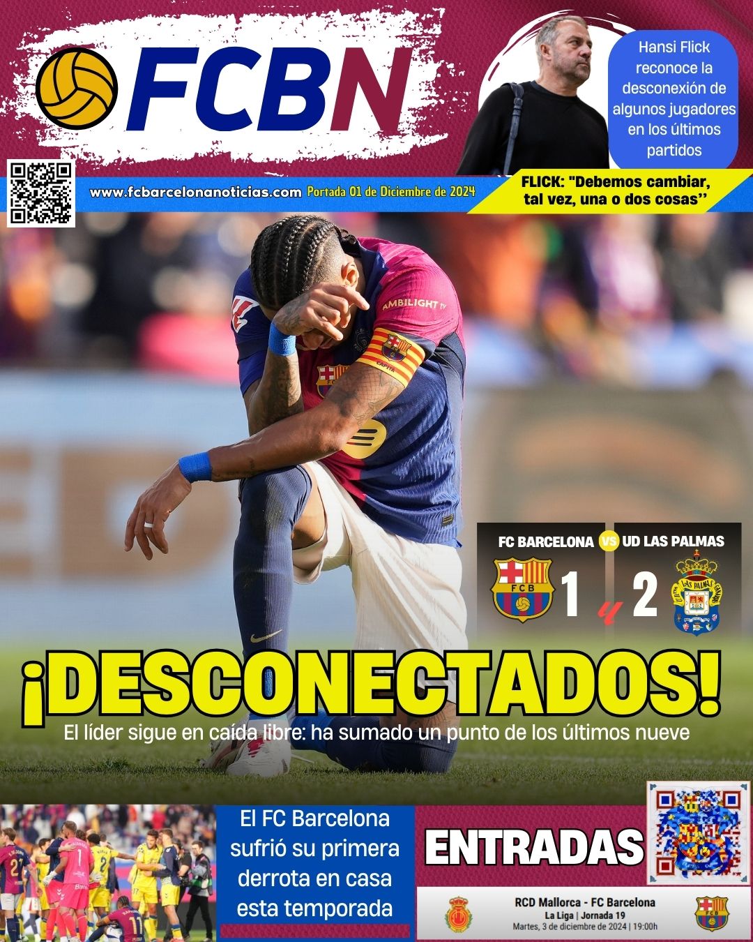 Portada de FC BARCELONA NOTICIAS del domingo 01 de DICIEMBRE de 2024: El FC Barcelona no pudo conseguir la victoria frente a Las Palmas en su 125 aniversario, los azulgranas estuvieron desconectados durante toda la primera parte del encuentro, a pesar de reaccionar en la segunda mitad, la gran actuación del portero del conjunto canario, sumado al pésimo arbitraje Cordero Vega, que no señaló hasta dos penaltis claros a favor del conjunto culé, provocó una derrota inesperada del equipo de Hansi Flick, que cayó derrotado en Montjüic, por primera vez en esta temporada.
