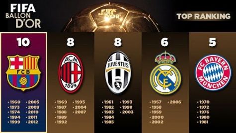 El FC Barcelona es primero en el ranking con un total de 10 Balones de Oro después de que Messi lo haya ganado cuatro años seguidos. Supera a Milan y Juventus, que tienen ocho. En los últimos 10 años el Barça ha sido el club que más Balones de Oro se ha llevado, un total de cinco, cuatro de los últimos seis de Messi