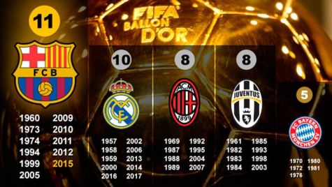 A pesar de que Cristiano Ronaldo se haya llevado el premio de este año, el FC Barcelona sigue siendo el club que tiene más Balones de Oro a lo largo de su historia, principalmente gracias a los cinco galardones que ha conseguido Leo Messi