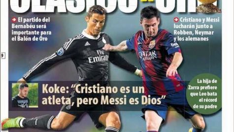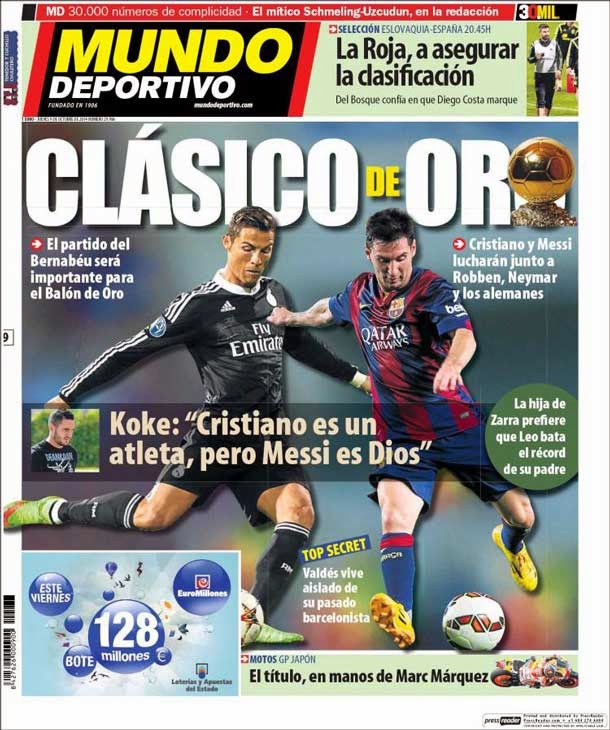 Portada Mundo Deportivo, jueves 9 de octubre de 2014. El partido del Bernabéu será importante para el Balón de Oro. Cristiano y Messi lucharán junto a Robben, Neymar y los alemanes.