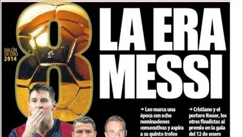 Portada del periódico Mundo Deportivo, martes 2 de diciembre de 2014. Leo marca una época con ocho nominaciones consecutivas y aspira a su quinto Balón de Oro. Cristiano y el portero Neuer, los otros finalistas al premio en la gala del 12 de enero.