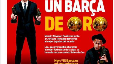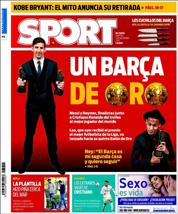 Portada del periódico Sport, martes 1 de diciembre de 2015. Messi y Neymar, finalistas junto a Cristiano Ronaldo del trofeo al mejor jugador del mundo. Leo, que ayer recibió el premio al mejor futbolista de la Liga, va lanzado hacia su quinto Balón de Oro.