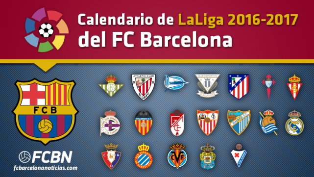 El FC Barcelona ya conoce quiénes serán sus rivales en cada una de las 38 jornadas de la Liga 2016-17. El primer contrincante del Barça en la Liga 2016-17 será el Real Betis en la primera jornada del 20 de agosto, mientras que el último será el Eibar también en el Camp Nou. En medio, los Clásicos de Liga se jugarán el 3 de diciembre en el Camp Nou y el 22-23 de abril en el estadio Santiago Bernabéu, mientras que los partidos contra el Atlético de Madrid llegarán el 21 de septiembre y el 25-26 de febrero.