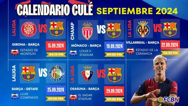 Los partidos del mes de septiembre finalizarán en Pamplona ante el Osasuna en la jornada 8. Esta será la primera ocasión que el club blaugrana juegue ante un equipo que cambió de entrenador en verano. Será Vicente Moreno el que intentará ganar en El Sadar, el sábado 28 de septiembre a las 21:00 horas. Sin duda, un mes bastante movido para el conjunto culé, el cual se espera sea todo un éxito.