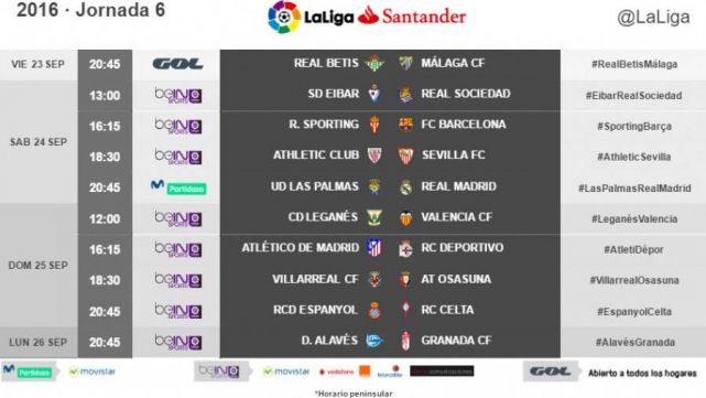 LaLiga 2016-2017 - Horarios de la jornada 6