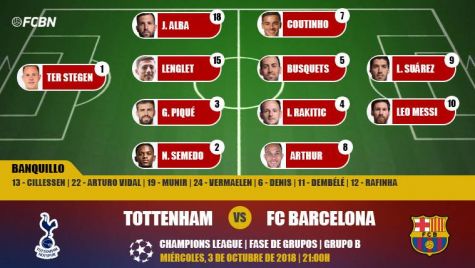 Ernesto Valverde apostó por su once de gala para el duro partido contra el Tottenham Hotspur, aunque con una variante importante: se cayó del equipo Ousmane Dembélé, que no estuvo fino en los últimos choques contra el Leganés y el Athletic Club, y apostó por Arthur Melo.