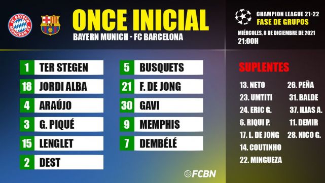 Xavi Hernández ha revelado ya la alineación con la que el FC Barcelona se enfrentará al Bayern de Múnich en el Allianz. Este es el XI del Barça: Ter Stegen; Dest, Piqué, Araújo, Lenglet, Jordi Alba; Busquets, De Jong, Gavi; Dembélé y Memphis