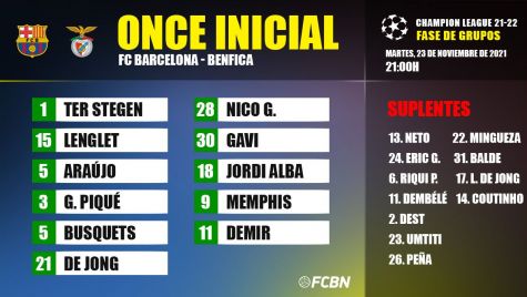 - XI del FC Barcelona: Ter Stegen; Piqué, Araújo, Lenglet; Gavi, Busquets, De Jong, Nico; Jordi Alba, Memphis Depay y Demir.