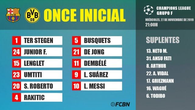 Ernesto Valverde ha revelado la alineación con la que el FC Barcelona se enfrentará al Borussia Dortmund en el Camp Nou. Este es el XI del Barça: Ter Stegen; S. Roberto, Umtiti, Lenglet, Junior; Busquets, De Jong, Rakitic; Messi, Dembélé y Luis Suárez