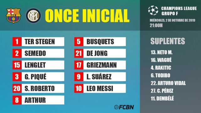 Ernesto Valverde ha revelado ya la alineación con la que el FC Barcelona se enfrentará al Inter de Milán este miércoles en el Camp Nou. Este es el XI del Barça: Ter Stegen; Semedo, Piqué, Lenglet, Sergi Roberto; Busquets, Arthur, De Jong; Griezmann, Suárez y Leo Messi
