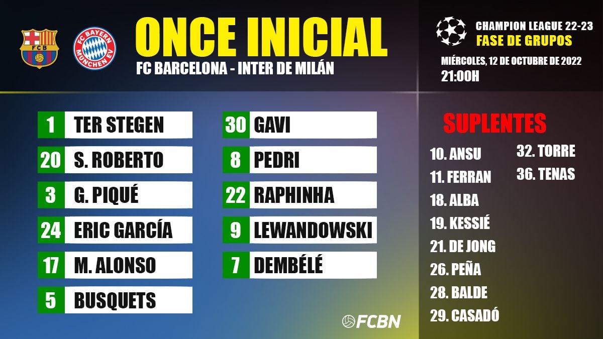 - XI del FC Barcelona: Ter Stegen; Roberto, Piqué, Eric, Alonso; Busquets, Gavi, Pedri; Raphinha, Lewandowski y Dembélé.