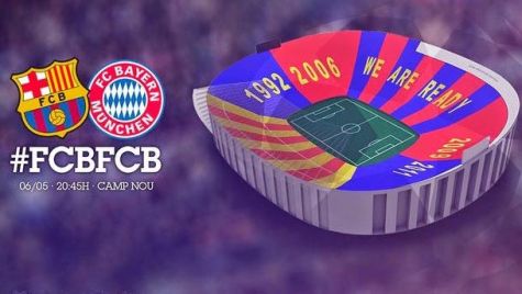 Este miércoles el Camp Nou vestirá sus mejores galas. Para recibir al Bayern un total de 94.000 cartulinas formarán un mosaico con los colores del Barça y de la "senyera", además del lema central "We are ready" ("Estamos preparados") con los años de las 4 Champions ganadas