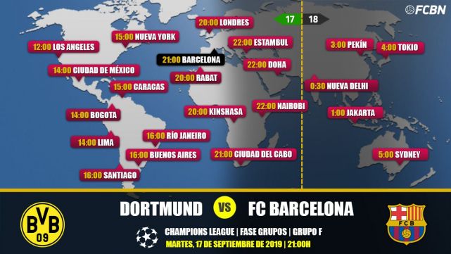 En España, el Borussia Dortmund-Barça será televisado en directo el martes 17 de septiembre a las 21:00 horas por los canales Movistar Liga de Campeones (canales 50 y 114), Movistar Liga de Campeones 2 (canales 52 y 127), mitele PLUS y LaLiga TV Bar, a través de los operadores Movistar, Orange y Mitele, que ofrecerán el partido en Internet y con acceso desde tu móvil, tablet, ordenador o Samart TV.
