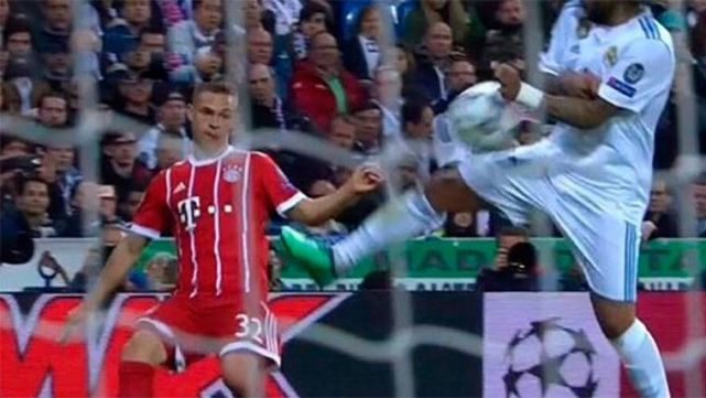 Sin embargo, como ya pasó en los cuartos de final contra la Juventus de Turín, el Real Madrid recibió una inestimable ayuda arbitral en forma de penalti no pitado. En una acción del primer tiempo, Kimmich recorrió la banda derecha y buscó un centro al interior del área, pero la pelota se topó con la mano de Marcelo, separada del cuerpo, que despejó el balón y desbarató el peligro de manera ilegal, aunque impune.