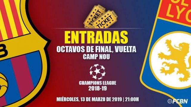 Ya puedes comprar las entradas para el partido FC Barcelona-Olympique de Lyon de la Champions League 2018-2019. Tras empatar 0-0 en Lyon, ahora el segundo y decisivo partido de vuelta de octavos de final de la Liga de Campeones Barça-Lyon se juega en el estadio del Camp Nou el miércoles 13 de marzo de 2019 a las 21:00 horas.