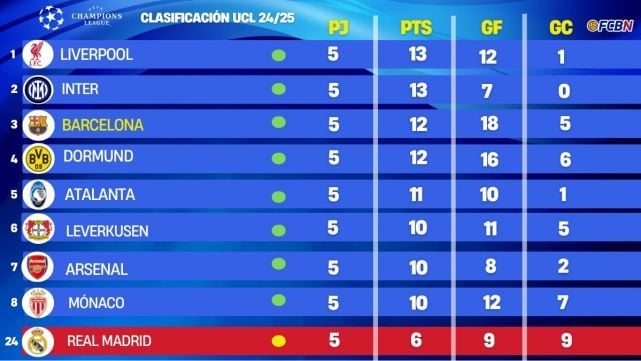 La quinta jornada de la Champions League 2024/25 culminó con varios resultados inesperados y muchas sorpresas en la clasificación. El Liverpool es el líder indiscutible del campeonato con un pleno de victorias, seguido del Inter de Milán en el 2° lugar. Por su parte, el FC Barcelona escaló hasta el 3° puesto después de la goleada al Brest y tiene encaminada la clasificación directa a los octavos de final.
