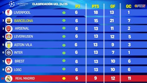 Las primeras 8 posiciones las completan Arsenal (3°), Bayer Leverkusen (4°), Aston Villa (5°), Inter de Milán (6°), Brest (7°) y Lille (8°). Ya en zona de 'play off' se encuentran Dortmund (9°), Bayern Múnich (10°), Atlético de Madrid (11°), Milan (12°), Atalanta (13°), Juventus (14°), Benfica (15°) y Mónaco (16°), con los colchoneros dando un salto importante en la tabla gracias a su victoria contra el Slovan Bratislava (3-1).