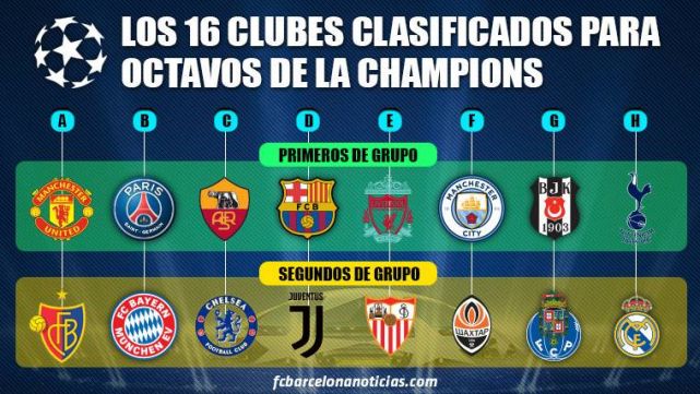 Finalizada la jornada 6 de la fase de grupos de Champions League, ya se conocen todos los equipos que disputarán la ronda de octavos de final del torneo, el Barcelona entre ellos. No ha habido grandes sorpresas, a excepción de la ausencia del Atlético