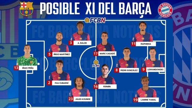 El Barça llega con la motivación de haber recuperado a tres piezas claves, Gavi, Fermín y Dani Olmo. Bajo estas circunstancias, y pese a la posible baja de Eric García, se espera que Hansi Flick ponga toda 'la carne en el asador'. A continuación, te mostramos las posibles formaciones titulares de Barcelona y Bayern: