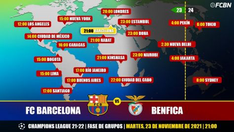 En España, el FC Barcelona-Benfica será televisado en directo el martes 23 de noviembre a las 21:00 horas por los canales Movistar Liga de Campeones, Movistar Liga de Campeones 2 y LaLiga TV Bar, a través de los operadores Movistar y Orange, que ofrecerán el partido en Internet y con acceso desde tu móvil, tablet, ordenador o Smart TV.