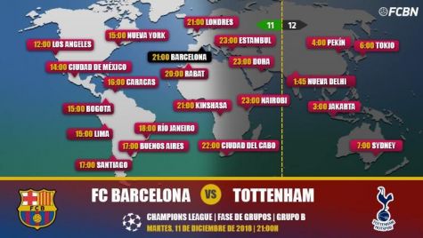 En España, el Barcelona-Tottenham será televisado en directo el martes 11 de diciembre a las 21:00 horas por los canales M. Liga de Campeones (canal 50 de Movistar ), M. Liga de Campeones 2 (Multichampions, canal 52 de Movistar ) y LaLiga TV (Bar), a través de los operadores Movistar y Orange, que ofrecerán también el partido en Internet y con acceso desde cualquier PC/MAC, tablet o smartphone.