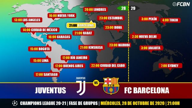 En Sudamérica, Centroamérica, Caribe, México y Brasil, el partido Juventus contra Barcelona podrá verse en vivo a través de los siguientes horarios y canales de televisión: ESPN, FOX Sports, DAZN y EI Plus.