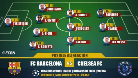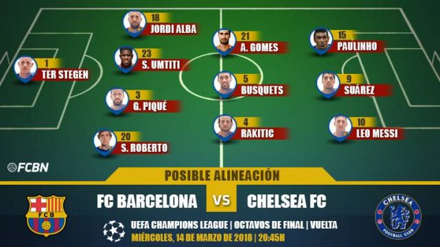 El duelo contra el Chelsea se prevé duro y, ante la necesidad imperiosa de conseguir un buen resultado, es probable que Ernesto Valverde saque todo el músculo disponible en la plantilla para fortalecer el centro del campo. Sergio Busquets jugará por delante de la defensa, con Paulinho e Ivan Rakitic acompañándole como interiores. André Gomes podría acompañarles, en el caso de que Valverde no apueste por Andrés Iniesta.