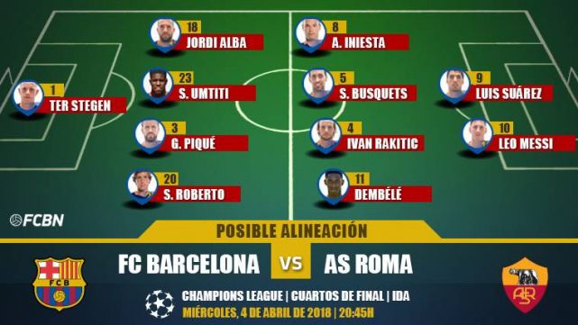 El duelo contra la Roma se prevé duro pero también con espacios, y ante la necesidad del Barça de conseguir un buen resultado, es probable que Ernesto Valverde saque toda la pólvora desde el principio para intentar dominar al rival. Sergio Busquets jugará por delante de la defensa, con Iniesta e Ivan Rakitic acompañándole como interiores. Dembélé podría acompañarles, ligeramente más adelantado, en 4-4-2.