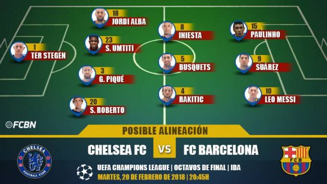 El duelo contra el Chelsea se prevé duro y, ante la necesidad imperiosa de conseguir un buen resultado, no se prevén demasiados experimentos de Ernesto Valverde en el centro del campo. Sergio Busquets jugará por delante de la defensa, con Andrés Iniesta e Ivan Rakitic acompañándole como interiores. Paulinho o André Gomes, si entran en el once, podría intercambiar posición con Iniesta.