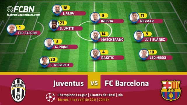 FC Barcelona: Ter Stegen; S. Roberto, G. Piqué, S. Umtiti, J. Alba; Mascherano, Iniesta, Rakitic; Neymar, Messi y Suárez.