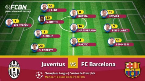 La ausencia más destacada del FC Barcelona será la de Busquets, ausente por acumulación de amarillas, pero Mascherano ocupará su lugar en el once, aunque se desconoce todavía si será en 4-3-3 actuando de pivote defensivo o si, por el contrario, Luis Enrique decidirá cambiar el esquema e incluir al argentino en una defensa de tres con Umtiti y Piqué con un 3-4-3 y Sergi Roberto en el centro del campo. Desde "FCBN" apostamos por la primera opción, al poder incluir Luis Enrique con ella a sus mejores jugadores: