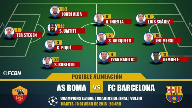Leo Messi y Luis Suárez partirán como siempre en el once inicial, sea en un 4-4-2 o en un 4-3-3 que tenga como objetivo aprovechar al máximo los contraataques, mientras que Dembélé puede ayudarles a formar un tridente letal al contragolpe, y también en estático, para impedir que la Roma esté tranquila atrás cuando intente acercarse a la portería de Ter Stegen. En la segunda mitad, Alcácer, Paulinho y/o Denis podrían tener opciones en función de si el Barcelona ha conseguido cerrar ya o no la eliminatoria