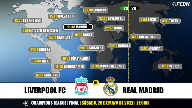 En España, el Liverpool Real Madrid será televisado en directo el sábado 28 de mayo, a las 21:36 horas por el canal Movistar Liga de Campeones, Movistar Liga de Campeones UHD, La 1 TVE, RTVE Play, ZDF y LaLiga TV Bar. Además, también se verá a través de los operadores Movistar y Orange, que ofrecerán el partido en Internet y con acceso desde tu móvil, tablet, ordenador o Smart TV.