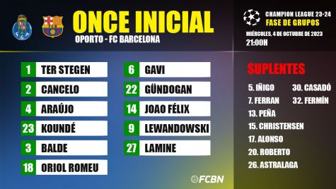 El FC Barcelona ya ha revelado la alineación con la que enfrentará al Oporto en el Estadio do Dragão (Oporto), por la segunda jornada de la fase de grupos de Champions 2023/24. Este es el XI del Barça: Ter Stegen, Cancelo, Araújo, Koundé, Balde; Oriol, Gündogan, Gavi; Joao Félix, Lewandowski y Lamine