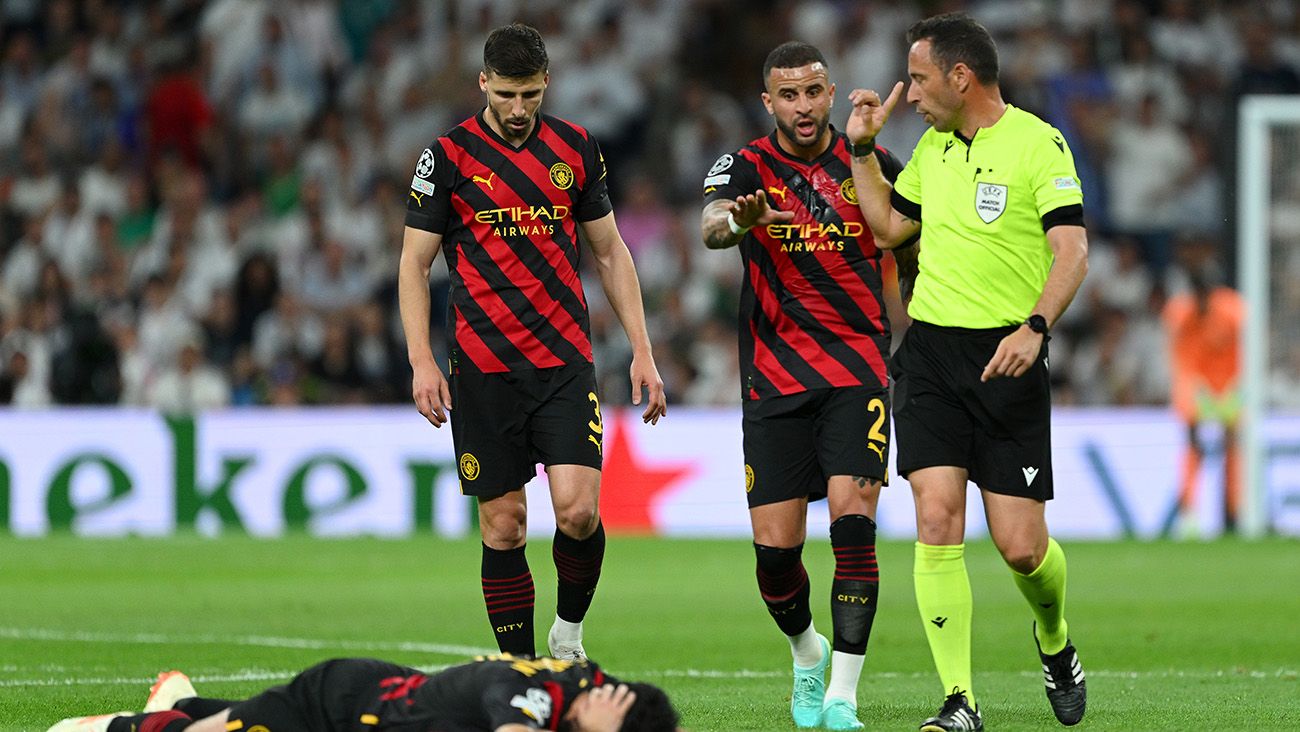 En la primera parte, el Madrid bien pudo marcharse al vestuario con un jugador menos. En el comienzo del partido, Dias dejó pasar un codazo de Antonio Rüdiger a İlkay Gündogan que ni siquiera fue sancionado con infracción. El árbitro se vio obligado a detener el compromiso ante las quejas de Kyle Walker, ya que Gündogan permaneció tirado boca abajo por varios segundos sobre el césped del Bernabéu.