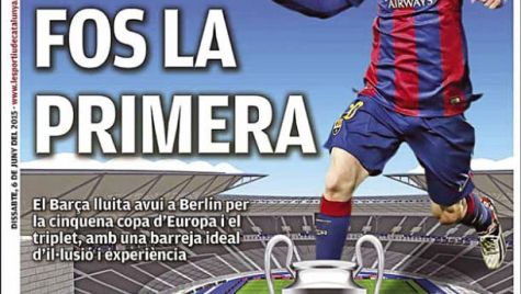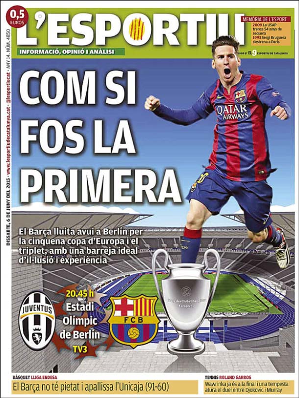 Portada del periódico L´Esportiu, sábado 6 de junio de 2015. El Barça lucha hoy en Berlín por la quinta Copa de Europa y el triplete, con una mezcla ideal de ilusión y experiencia.