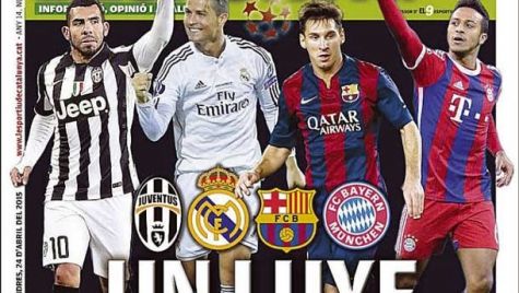 Portada del periódico L´Esportiu, viernes 24 de abril de 2015. El Barça espera rival en unas semifinales de altísimo nivel con los deberes hechos y la cabeza en el derbi contra el Espanyol.