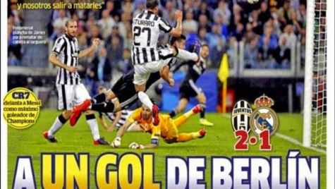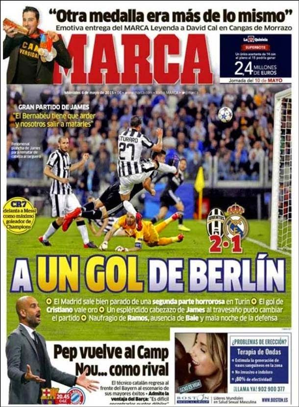 Portada del periódico Marca, miércoles 6 de mayo de 2015. El Madrid sale bien parado de una segunda parte horrorosa en Turín. El gol de Cristiano Ronaldo vale oro. Naufragio de Sergio Ramos, ausencia de Bale y mala noche de la defensa.