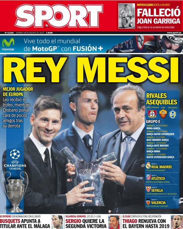 Portada del diario Sport, viernes 28 de agosto de 2015. Mejor Jugador de Europa: Leo recibió el trofeo, mientras Cristiano ponía cara de pocos amigos tras su derrota. Rivales asequibles en el sorteo de la Champions: Bayer Leverkusen, AS Roma y BATE Borisov