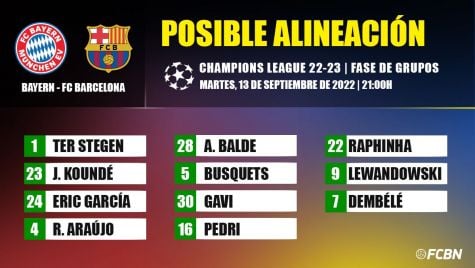 El Barça ha 'sufrido' grandes cambios desde la última vez que enfrentó al cuadro muniqués, en diciembre del año pasado (3-0). Los blaugrana han revolucionado su plantilla y están con la ilusión a tope, en medio de un arranque de temporada sensacional en el que suman cinco triunfos consecutivos, de seis partidos. Para la ocasión, Xavi Hernández sacará lo mejor que tiene al campo para buscar tres puntos que sabrán a reinvindicación para los culés. A continuación, nuestra previsión de las alineaciones: