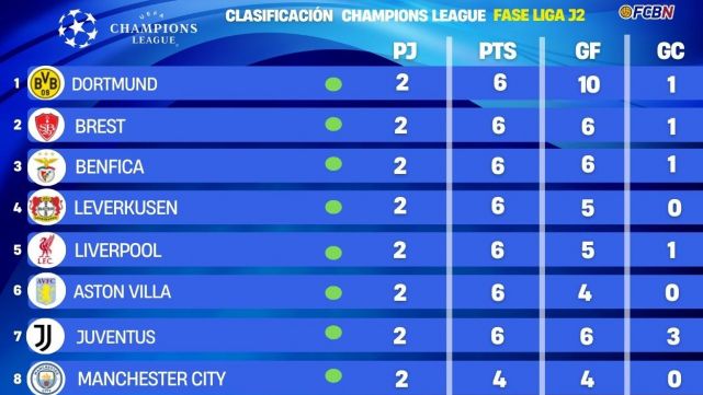 La zona alta de la clasificación tiene a Borussia Dortmund, Stade Brest y Benfica como líderes con 6 puntos. Los alemanes aplastaron al Cletic Glasgow (6-1) liderados por un gran Karim Adeyemi (marcó un 'hat trick'), mientras que el conjunto galo también se impuso con autoridad en campo del RB Salzburgo (0-4). Por su parte, los lusos arrollaron al Atlético de Madrid en casa (4-0) y sumó su segundo triunfo al hilo.