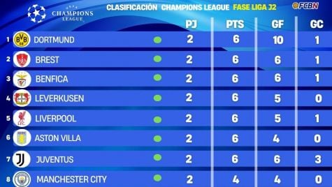 El Borussia Dortmund es el sorprendente líder de la Champions tras dos jornadas. Por su parte, el Barça (16°) ya adelantó al Real Madrid (17°) en la tabla