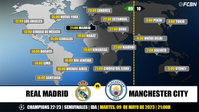 Real Madrid CF y Manchester City se enfrentan este martes 09 de mayo a las 21:00 horas (9 PM CET) en el estadio Santiago Bernabéu (Madrid). El encuentro corresponde a la ida de las semifinales de la UEFA Champions League 2022-2023 y enfrenta al Real Madrid entrenado por Carlo Ancelotti y el Manchester City de Pep Guardiola. A continuación, repasamos los horarios y dónde ver este partido de fútbol en TV.