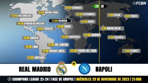 Real Madrid y Napoli se enfrentan este miércoles 29 de noviembre, a partir de las 21:00 horas (9:00 PM CET), en el Estadio Santiago Bernabéu (Madrid). El encuentro corresponde a la jornada 5 de la fase de grupos de la Champions League 2023-2024 y enfrenta al Madrid de Carlo Ancelotti y al Nápoles entrenado por Walter Mazzarri. A continuación, repasamos los horarios y dónde ver este partido de fútbol en TV.