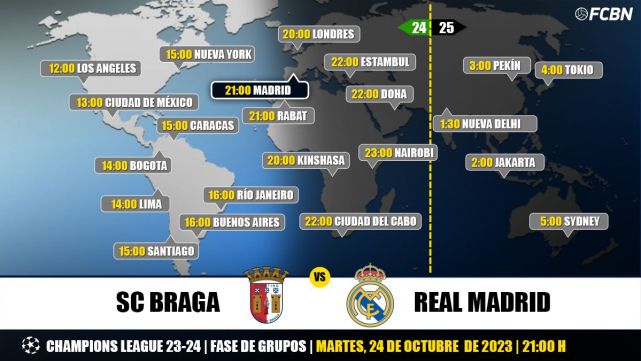 En Estados Unidos, el partido de la fase de grupos de la Champions League entre SC Braga y Real Madrid puede verse en vivo a partir de las 15:00 horas (3:00 PM, Washington) y las 12:00 (12:00 PM, Los Ángeles) a través de TUDN, Univision y Paramount+. En Sudamérica, Centroamérica, Caribe, México y Brasil, el partido Braga contra Real Madrid podrá verse en vivo a través de los siguientes horarios y canales de televisión: Star+, ESPN, ESPN 2 y FOX Sports.