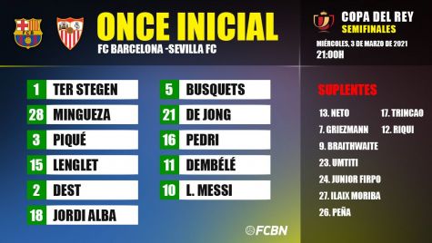 - XI del FC Barcelona: Ter Stegen; Mingueza, Piqué, Lenglet, Dest, Jordi Alba; Busquets, De Jong, Pedri; Messi y Dembélé.