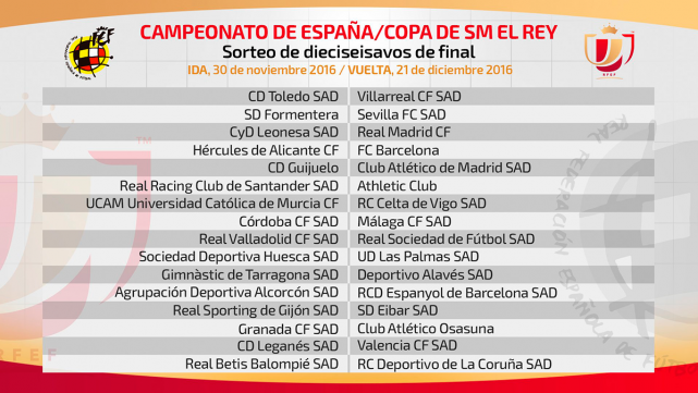 Este viernes tuvo lugar en la sede de la Real Federación Española de Fútbol el sorteo correspondiente a la ronda de dieciseisavos de la Copa del Rey 2016-2017 con encuentros entre los que destaca el Cultural-Madrid y el Hércules-Barça
